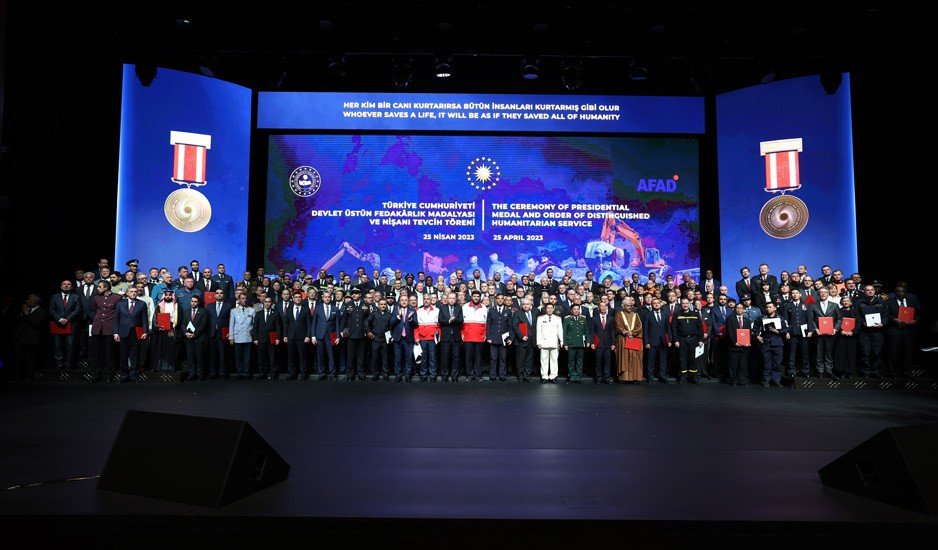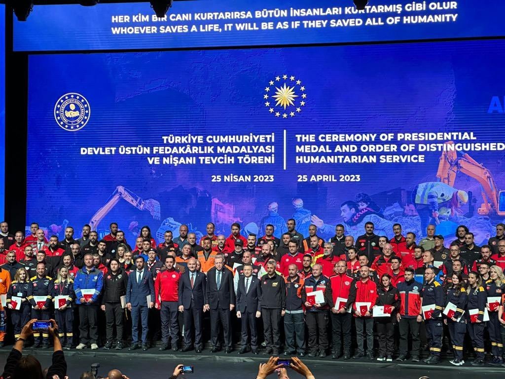 Cumhurbaşkanımız Sayın Recep Tayyip Erdoğan’ın teşrifleriyle gerçekleşen ‘Üstün Fedakarlık Madalyası Tevcih Töreni’nde, 6 Şubat depremlerinde, arama kurtarma çalışmalarında görev yapan yerli ve yabancı Arama Kurtarma Ekiplerine, ‘Üstün Fedakarlık Madalyası ve Nişanı’ takdim edildi.